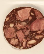 Blood Tongue, or Zungenwurst, is a variety of German head cheese with blood. It is a large head cheese that is made with pig’s blood, suet, bread crumbs and oatmeal with chunks of pickled beef tongue added.